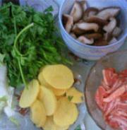 把白菜,香菇,香菜,豆皮切好,土豆切厚片,备用。
