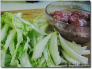 等水开煮上5分钟,充分味道出来,把白菜放入汤中煮,待白菜变软后捞出,装入汤碗,然后把肉片放入汤中略煮,捞出装入汤碗。