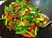 倒入红辣椒和菜薹梗,炒断生,调味,我这一斤肉放了半茶匙盐,一茶匙胡椒粉。