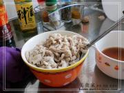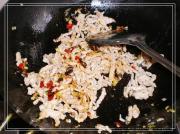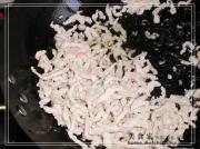 筷子夹着肉丝放到烧到6、7成热的油锅里,划散;待肉丝变白色(稍有点粉红色也没问题,千万不要炒老~做这道菜的整个过程都是用大火哦~)。