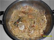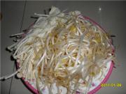 落老抽添汤加盐,鸡精,糖,煮至汤色稍微发白时加入豆芽和金针磨煮好。