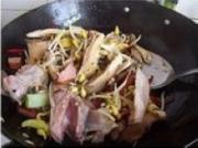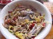 先用油小火炒葱姜八角,花椒,辣椒丝一半。倒入鱼头骨炒一会后,加入豆芽,蘑菇腊肉。炒均匀。