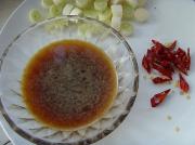 葱白切小段;生抽2勺、米醋2勺、鸡精1/2勺、白糖3勺、盐1/3勺,调匀成味汁。