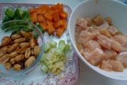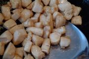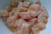 将鸡脯切丁,用料酒、生抽和淀粉搅拌腌制。