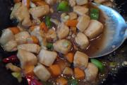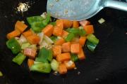 辣椒炸出香味,倒入胡萝卜和辣椒丁,翻炒两分钟。