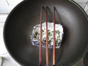 将煮好的猪肉放在筷子上。