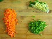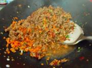 肉末放进去炒到分散发白,放一茶匙糖,放胡萝卜和姜葱末。