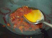 炒一汤匙红油豆瓣酱,一定要小火,搅拌,不要糊了,炒到提起铲子油是红色的即可。