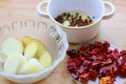 大蒜、生姜切大片,干尖椒剪成段,花椒洗净备用;