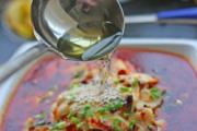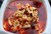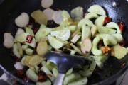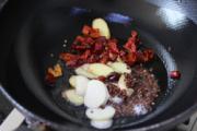 锅中倒入100克油,大火烧至七成热时,依次下入生姜、大蒜、干尖椒、花椒,爆香,小火炼出辣油;