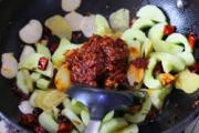 转大火,下入黄瓜和榨菜片爆炒;