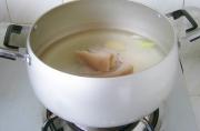 猪肘肉洗干净,冷水下锅,大火烧开后转中小火焖煮大概20分钟,中间需要 用大汤勺撇去浮沫。