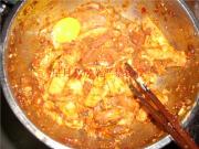 将码好味的肉中打入鸡蛋一个.顺时针方向调和均匀.这是我在一个资深人士那里学到的绝招.据说这样作出来的粉蒸肉才会干爽.不会象很多人做的那样.水滴滴的。