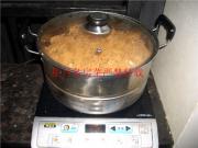 用纱布垫底。最下面一层铺上土豆。再以猪肉均匀平铺在上面,电磁炉大火蒸40分钟。