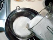 把搅打好糊状的豆浆过筛。