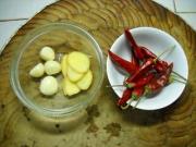 准备好生姜、独蒜和干红椒;生姜、独蒜去皮、洗净切片。
