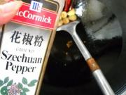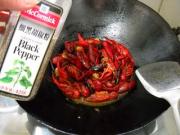 姜和辣椒拨一边,倒入花椒粉,炒出香味。
