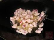 再加入炸熟的五花肉炒拌均匀,加入适量的盐调味。