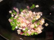 将油倒出,将牛油入锅烧融,下尖椒,洋葱下锅炒香。