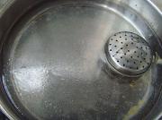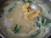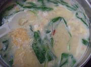 稍煮后捞出料盒,再放菠菜、粉条、红豆、花生米,水沸后立即倒入小米糊,边倒边搅。