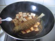 黄鱼去鳞挖腮和内脏洗净。豆腐切小块。生姜切片。大蒜切小段。