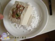 平底锅烧热,倒油,中小火,将豆腐底部粘干淀粉。
