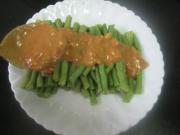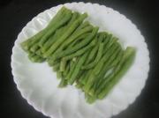 豇豆洗净,去筋,锅里水开,放些盐,油,放下豇豆焯熟。