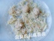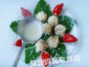 将调好的馅用手搓成丸子,放在拌好的干贝丝上滚沾均匀,成绣球状。