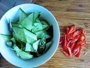 黄瓜和红椒洗净全部切菱形片。