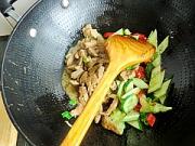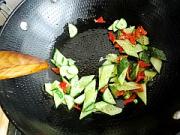 原锅洗净加入少许油烧热,倒入黄瓜和红椒翻炒均匀。