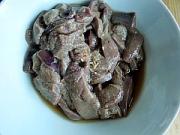 泡好的猪肝冲洗干净,加入少许盐,糖,料酒拌均匀。