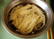 烫10秒立即捞出过冷水。 金针菇沥干水分排在盘子中,加入黄瓜丝备用。