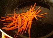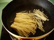 锅内用底油炒香胡萝卜,炒香后捞出摆在金针菇上面。