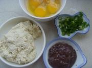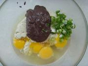 将豆腐泥、虾酱、鸡蛋、葱花、食用油倒入碗中。
