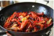 然后下入小龙虾爆炒,这时候的油温一定要高,注意翻炒均匀,至所有的虾尾都卷起,颜色变深时,加三勺盐,倒入一大勺料酒,烹香。