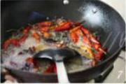 最后加入两大勺陴县豆瓣,一大勺香辣酱,一大勺麻辣酱,一大勺剁椒酱,两大锅铲醋,然后加入与虾齐平的水,炒匀,盖上锅盖,大火烧开后改中小火焖煮,至水分收干时,加少量鸡精和一小勺白糖调味,即可起锅。
