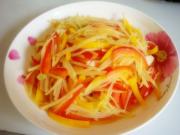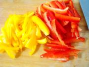 将红椒、黄椒洗净,切成细丝。