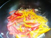 放入红椒、黄椒翻炒30秒,添加味精、香油调味即可。