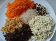 将泡发好的黑木耳、海米、冬菇、粉条与去皮胡萝卜、北豆腐切碎丁备用。