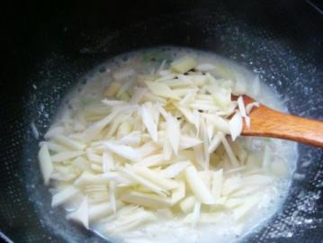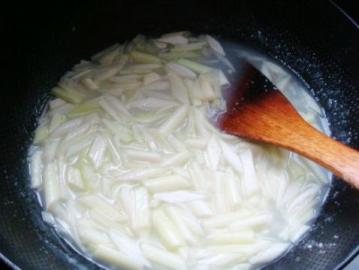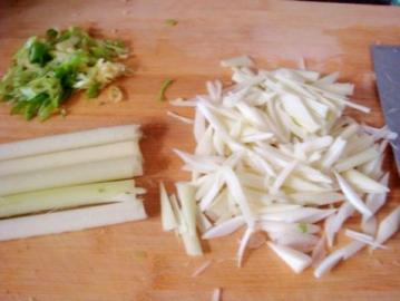 蒲菜切成细丝,葱、姜切碎,葱、姜切碎。