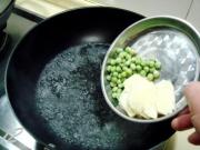 把笋片和青豌豆下入开水锅汆烫。