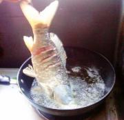 再舀油淋在鱼身上,待淀粉凝固时再把鱼慢慢放入油锅内。