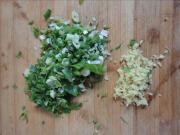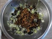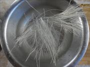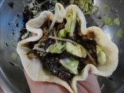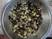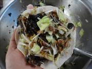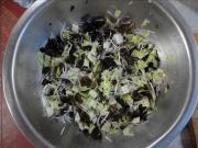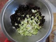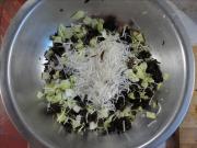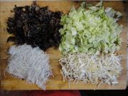 把木耳、包菜切成小丁,豆芽、粉丝切约一厘米的段。