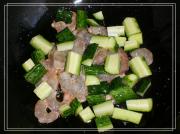 锅内倒油烧热,黄瓜和虾仁一起倒入加一勺清水,不断翻炒至虾仁变色。