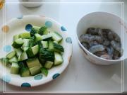 虾去头去壳挑去虾线洗净,放料酒略腌去腥;黄瓜切成和虾仁差不多大小的块儿。
