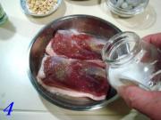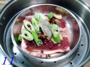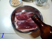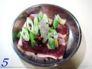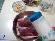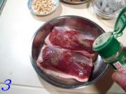 鸭肉上放上葱、姜、八角、桂皮、香叶、花椒等,腌制两小时。
