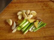 另起锅下油,放入葱段,姜片,蒜瓣炒香。