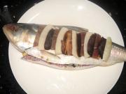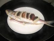 将冬菇、鲜笋、火腿切片,整齐码放在鱼身上,姜切片垫在鱼身下,部分切碎的姜、笋、火腿塞入鱼膛内。