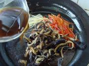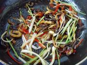锅内留底油,下入红椒丝、姜丝、素鳝丝炒拌断生,倒入味汁。