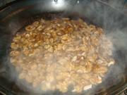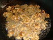 糖熬好后倒入沥干的桃仁不停的翻炒, 让每颗桃仁都均匀的上糖。